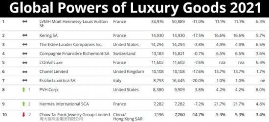德勤(Deloitte)发布2021奢侈品全球力量报告(Global Powers of Luxury Goods 2021),公布了2021年度全球100大奢侈品公司排行榜。路威酩轩集团、开云集团、雅诗兰黛集团蝉联前三位。进入前十名的还有历峰集团、欧莱雅Luxe、香奈儿、依视路陆逊梯卡、PVH集团、爱马仕和周大福集团。上榜企业总部主要在欧洲和美国,中国(包括香港)共有9家企业上榜。