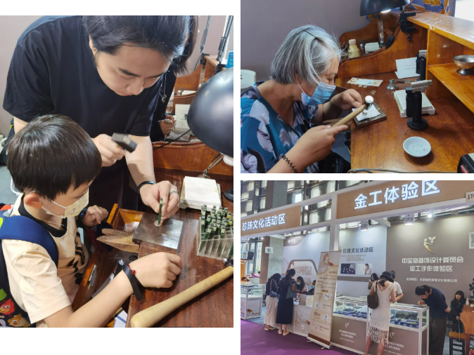 位于珍珠展区的“金工手作体验区”(展位号:1T01-1T11)也让珠宝爱好者们过了把手瘾,体验一番首饰加工的魅力,年长年幼都上阵!